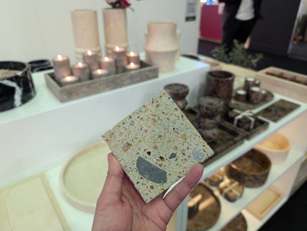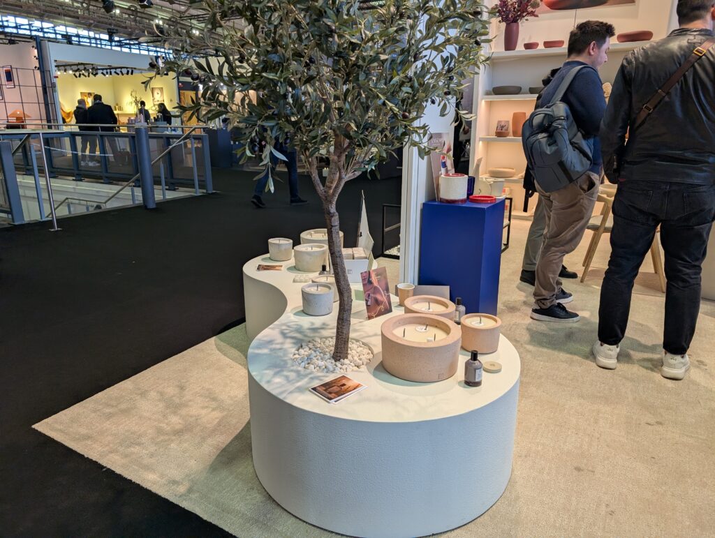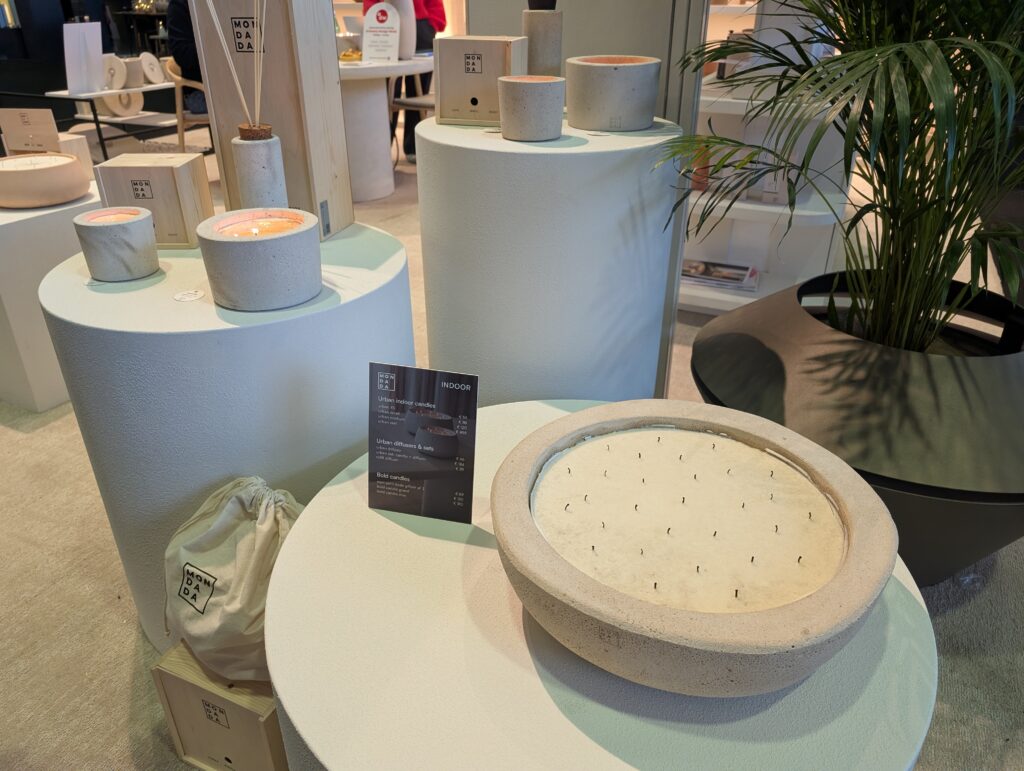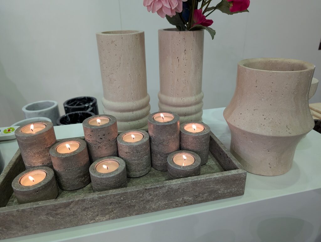 [石材を使用したキャンドルのブース] 非常に興味深かったのは、親子二代でコンクリートやポルトガル産の石材を使用してキャンドルを制作しているブランドです。 「中に蝋燭、周りが石」という構成ですが、石という重厚な素材をライフスタイルの中にどう溶け込ませるか、秋保石の親和性の高さを再確認しました。